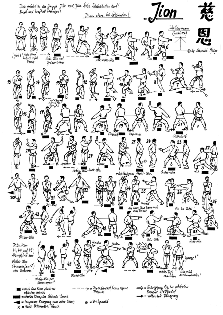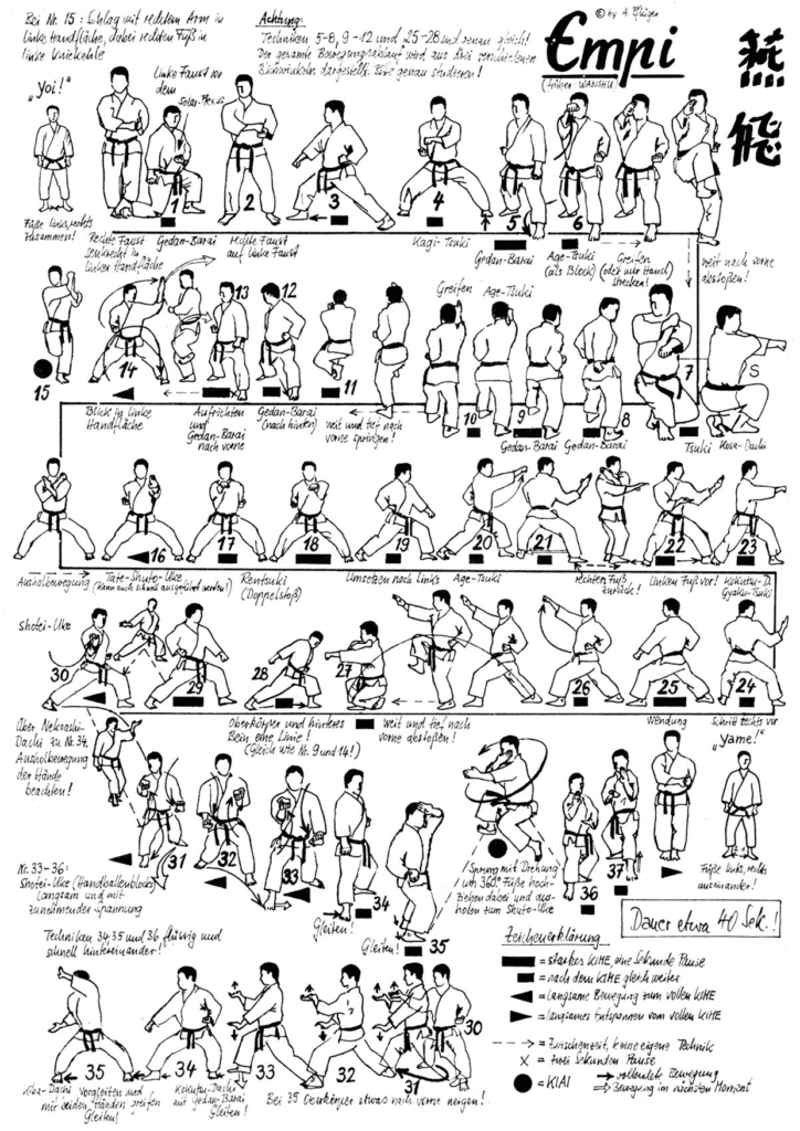 In der Prüfungsordnung Shotokan muss eine Kata aus der Jion, Kanku Dai, Empi oder Hangetsu gewählt werden.
