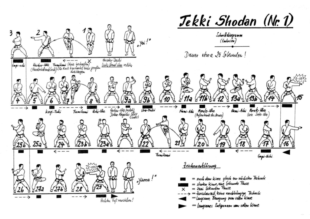 Der Prüfer kann noch zusätzlich eine andere Kata, wie z.B. die Heian Shodan verlangen. Daher müssen alle vorigen Kata immer geübt werden!