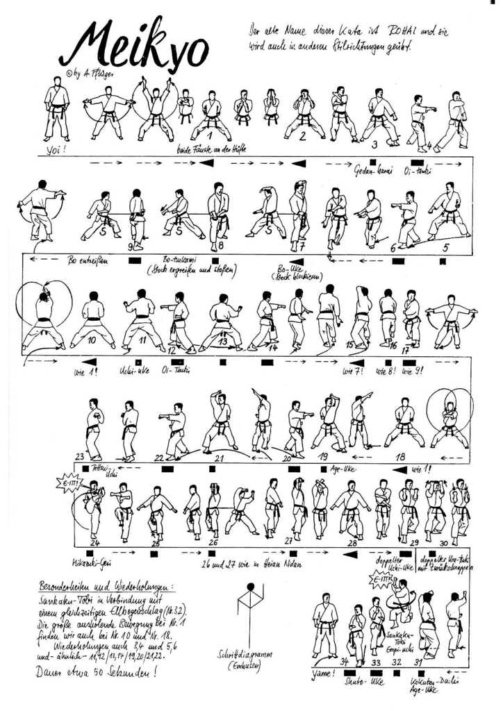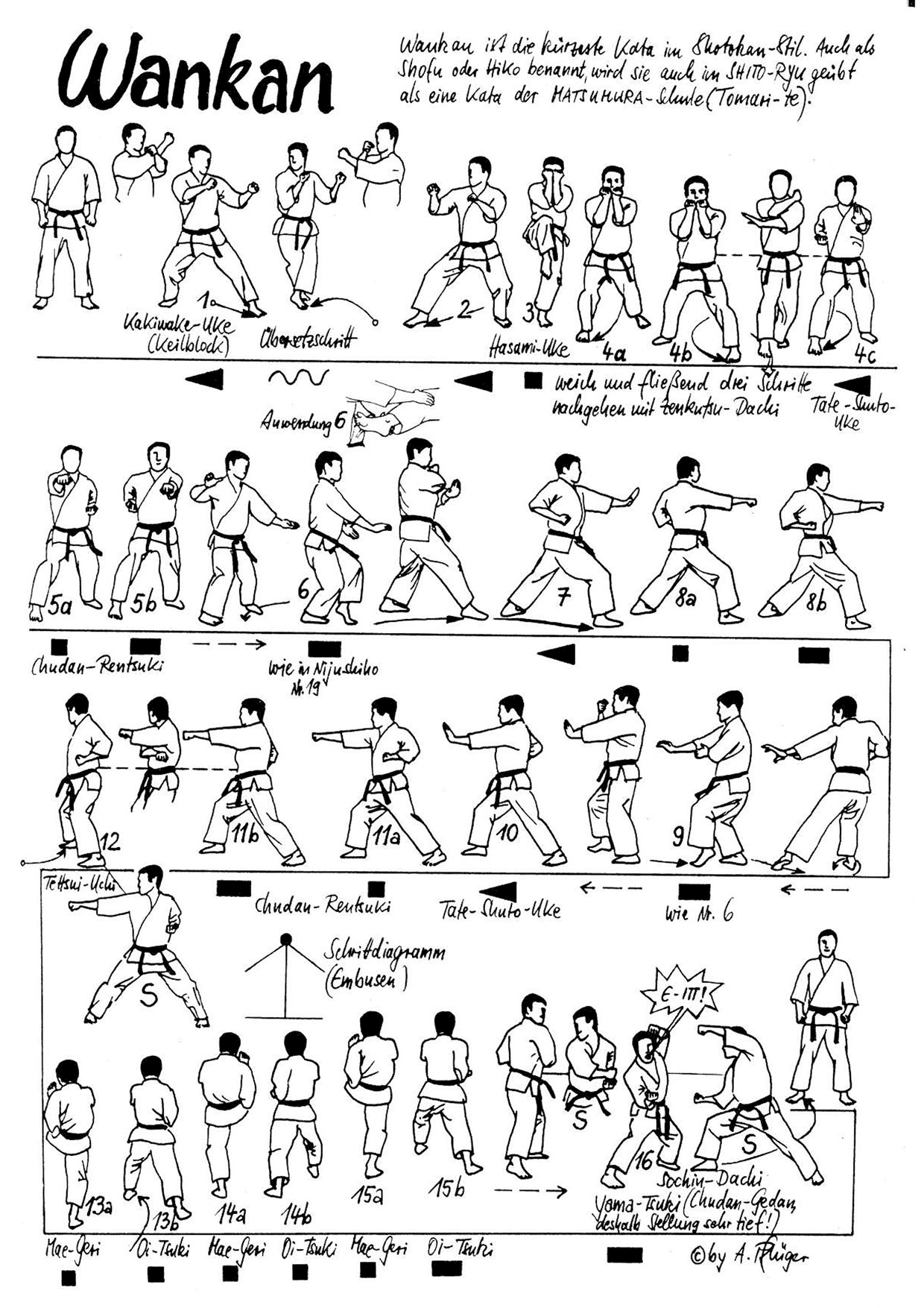 In der Prüfungsordnung Shotokan wird 1 Tokui Kata frei (nicht eine bisher gezeigte Kata) und der Prüfungsausschuss kann 2 Shitei Katas aus Tekki Sandan, Bassai Sho, Sochin, Meikyo, Jitte, Wankan verlangen.