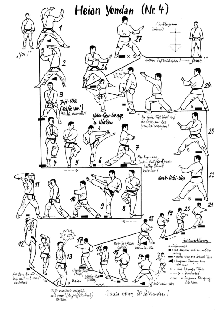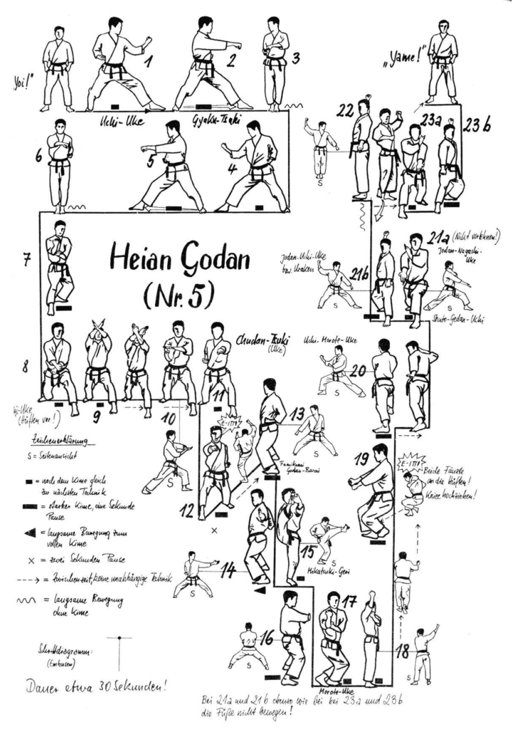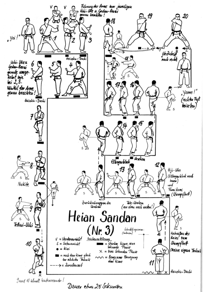 Der Prüfer kann noch zusätzlich eine andere Kata, wie z.B. die Heian Shodan verlangen. Daher müssen alle vorigen Kata immer geübt werden!